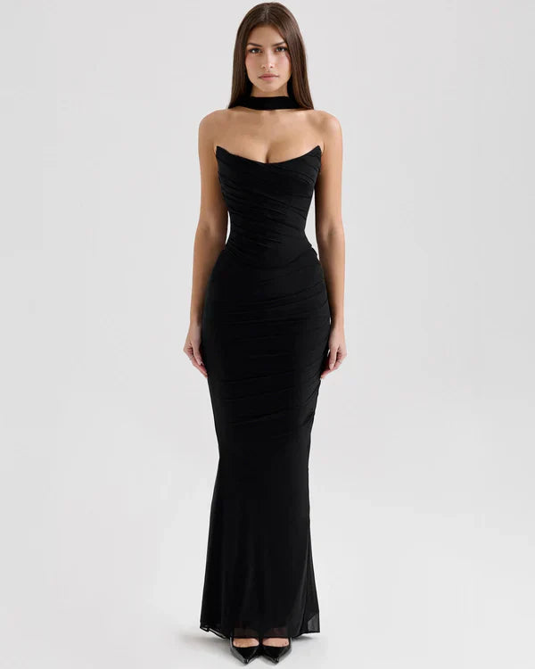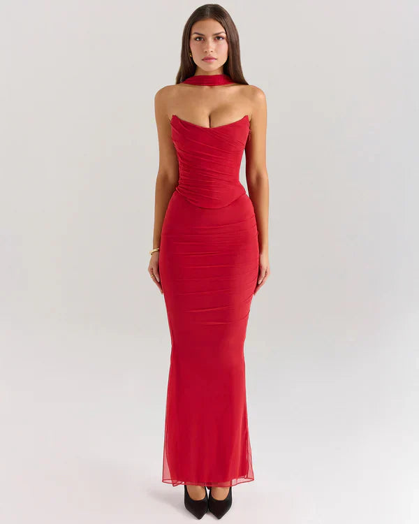 Nuestro conjunto «Malu» reinterpreta la silueta clásica de malla en un diseño moderno de tres piezas: corsé, falda maxi y bufanda a juego. Confeccionado en suave malla elástica, combina la estructura romántica del corsé con la fluidez de la falda fruncida de talle medio y cremallera lateral oculta. La bufanda ligera añade un toque versátil y elegante para un look sofisticado y atemporal.